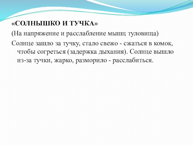 стало свежо - сжаться в комок, чтобы согреться (задержка дыхания). Солнце вышло из-за тучки, жарко, разморило - расслабиться.