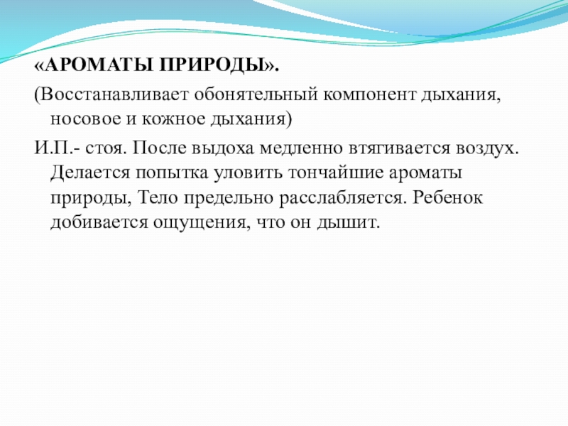 выдоха медленно втягивается воздух. Делается попытка уловить тончайшие ароматы природы, Тело предельно расслабляется. Ребенок добивается ощущения, что он дышит.