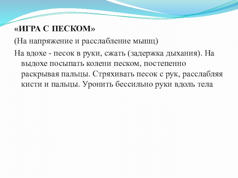 руки, сжать (задержка дыхания). На выдохе посыпать колени песком, постепенно раскрывая пальцы. Стряхивать песок с рук, расслабляя кисти и пальцы. Уронить бессильно руки вдоль тела