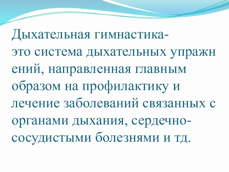 Слайд 2Дыхательная гимнастика-это система дыхательных упражнений, направленная главным образом на профилактику и лечение заболеваний связанных
