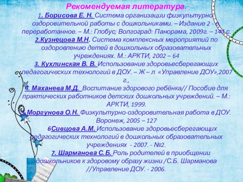 1. Борисова Е. Н. Система организации физкультурно-оздоровительной работы с дошкольниками.