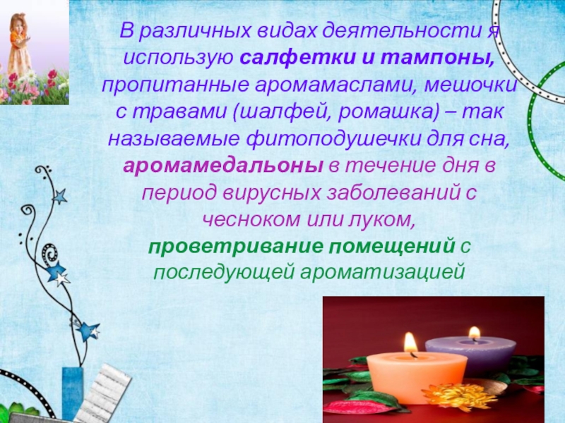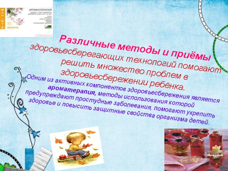 Одним из активных компонентов здоровьесбережения является ароматерапия, методы использования которой предупреждают простудные заболевания, помогают укрепить здоровье и повысить защитные свойства организма детей.