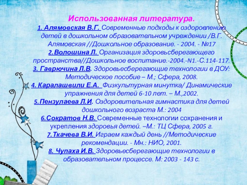 3. Кухлинская В. В. Использование здоровьесберегающих педагогических технологий в ДОУ. – Ж – л «Управление ДОУ»,2007 г.,
