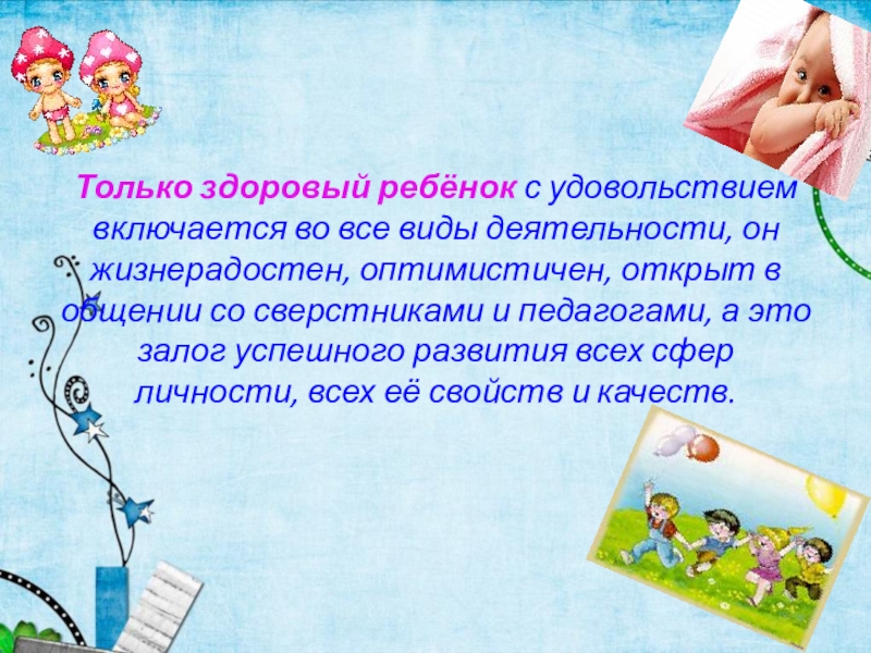 Слайд 30Только здоровый ребёнок с удовольствием включается во все виды деятельности, он