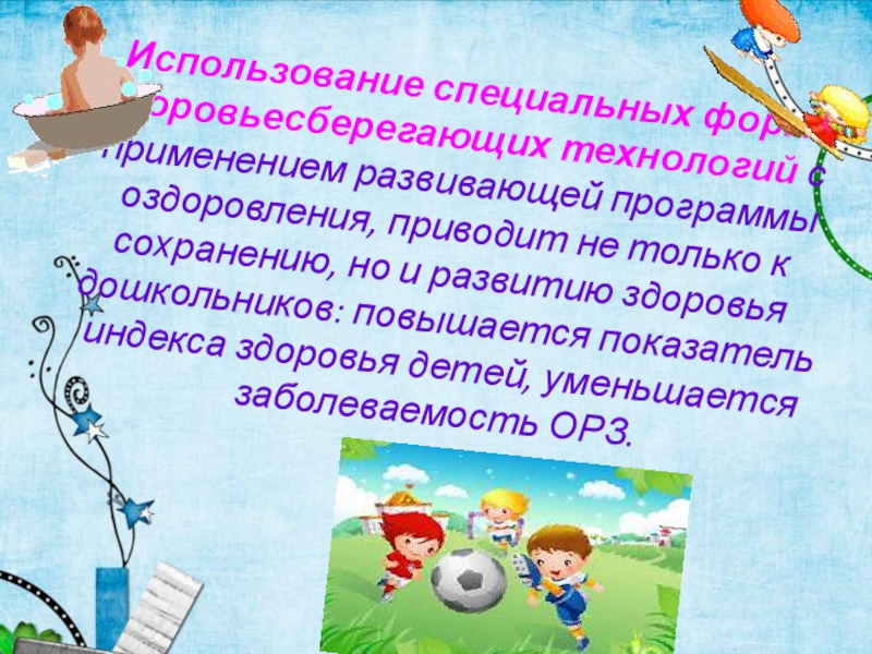 Слайд 9Использование специальных форм здоровьесберегающих технологий с применением развивающей программы оздоровления, приводит