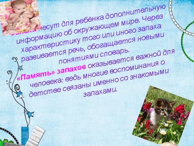 Слайд 19Запахи несут для ребёнка дополнительную информацию об окружающем мире. Через характеристику