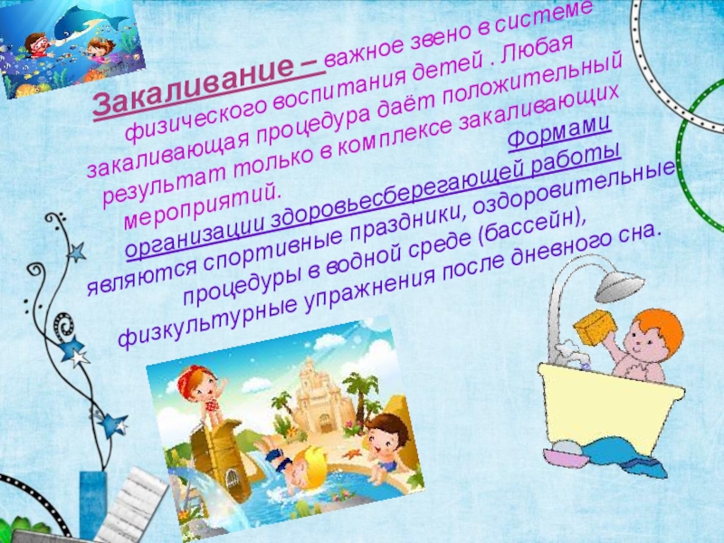 Слайд 10Закаливание – важное звено в системе физического воспитания детей . Любая