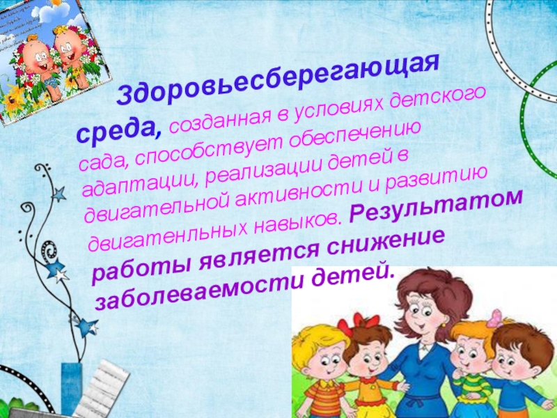 способствует обеспечению адаптации, реализации детей в двигательной активности и развитию двигатенльных навыков. Результатом работы является снижение заболеваемости детей.