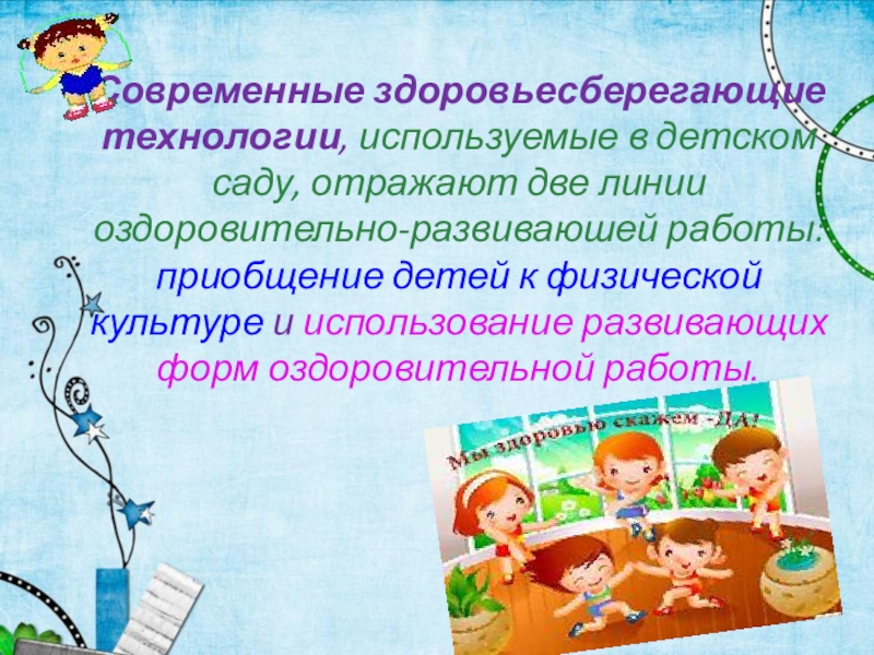 Слайд 6Современные здоровьесберегающие технологии, используемые в детском саду, отражают две линии оздоровительно-развиваюшей
