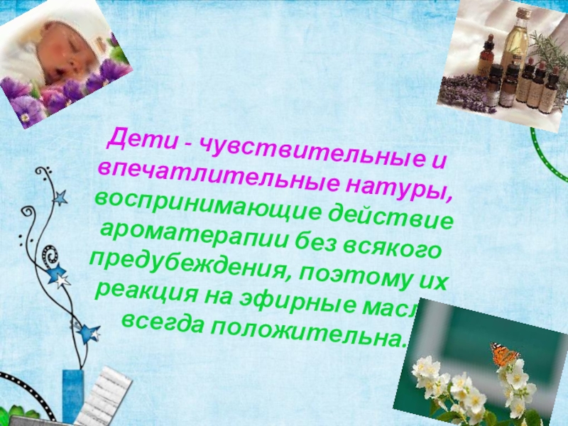 Слайд 24Дети - чувствительные и впечатлительные натуры, воспринимающие действие ароматерапии без всякого