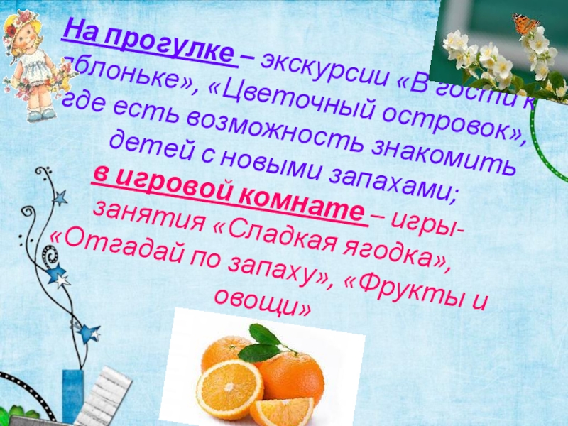 есть возможность знакомить детей с новыми запахами; в игровой комнате – игры-занятия «Сладкая ягодка», «Отгадай по запаху», «Фрукты и овощи»