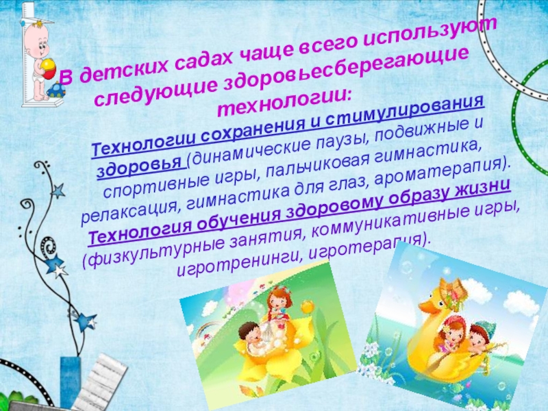 Слайд 8В детских садах чаще всего используют следующие здоровьесберегающие технологии: