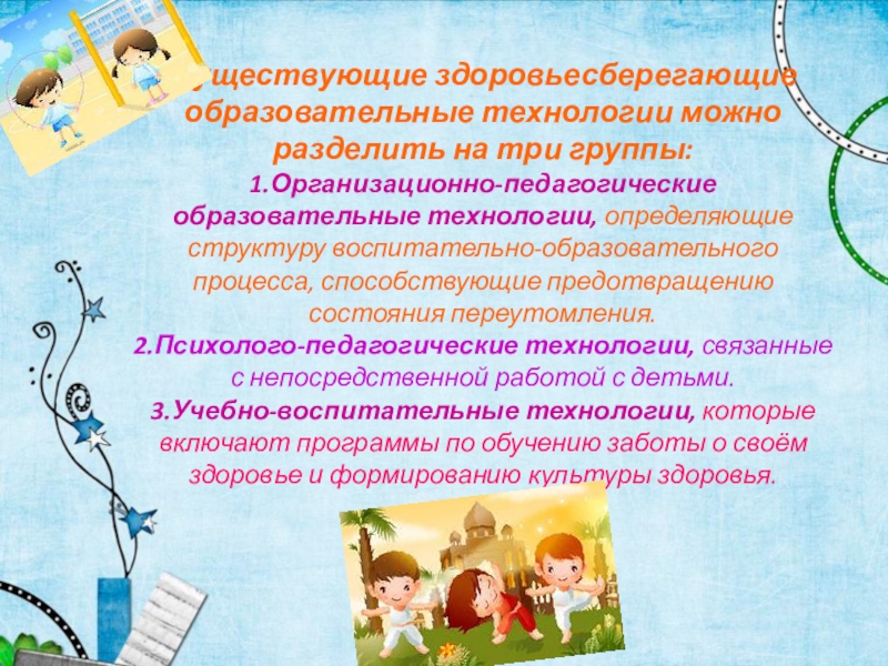 Слайд 7Существующие здоровьесберегающие образовательные технологии можно разделить на три группы: