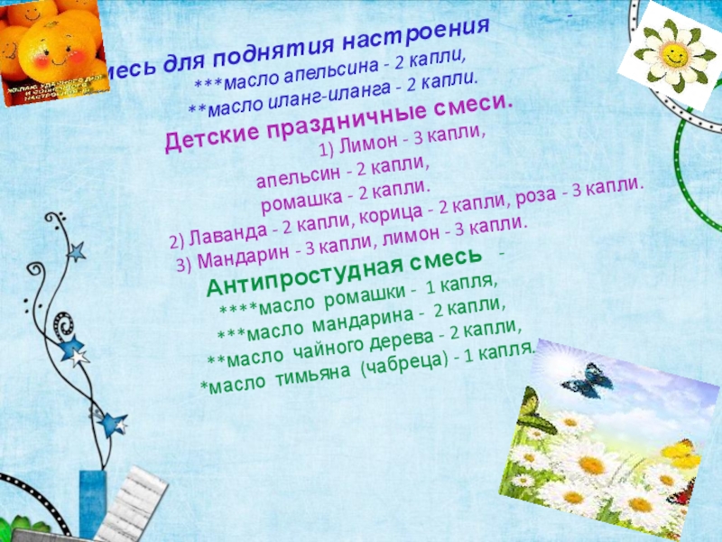 Антипростудная смесь - ****масло ромашки - 1 капля, ***масло мандарина - 2 капли, **масло чайного дерева - 2 капли, *масло тимьяна (чабреца) - 1 капля.