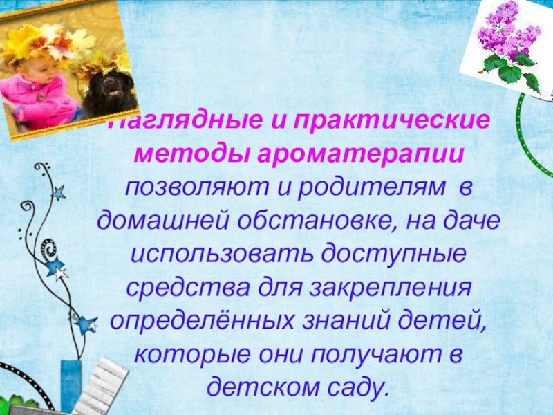 Слайд 23Наглядные и практические методы ароматерапии позволяют и родителям в домашней обстановке,