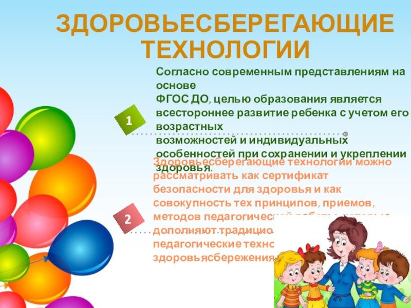 Здоровьесберегающие технологии можно рассматривать как сертификат безопасности для здоровья и как совокупность тех принципов, приемов, методов педагогической работы, которые дополняют традиционные педагогические технологии задачами здоровьясбережения.