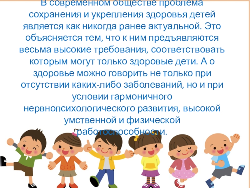 никогда ранее актуальной. Это объясняется тем, что к ним предъявляются весьма высокие требования, соответствовать которым могут только здоровые дети. А о здоровье можно говорить не только при отсутствии каких-либо заболеваний, но и при условии гармоничного нервнопсихологического развития, высокой умственной и физической работоспособности.