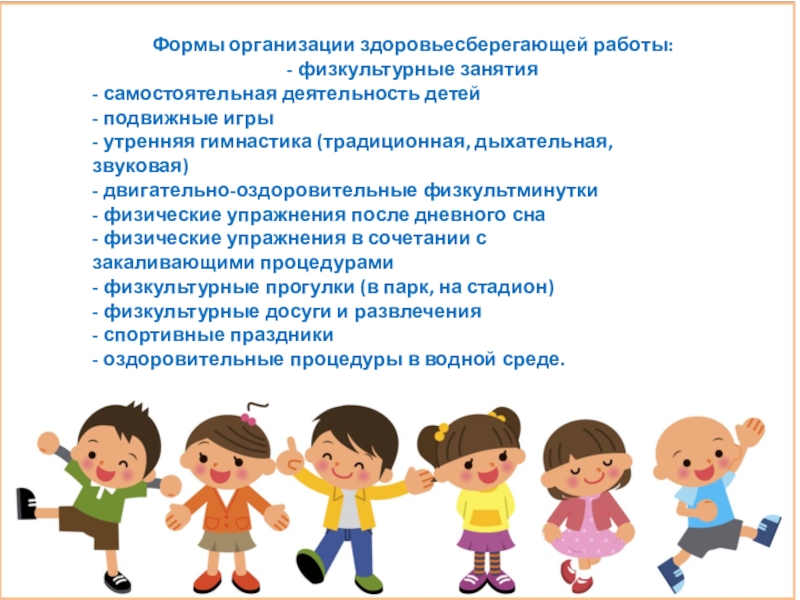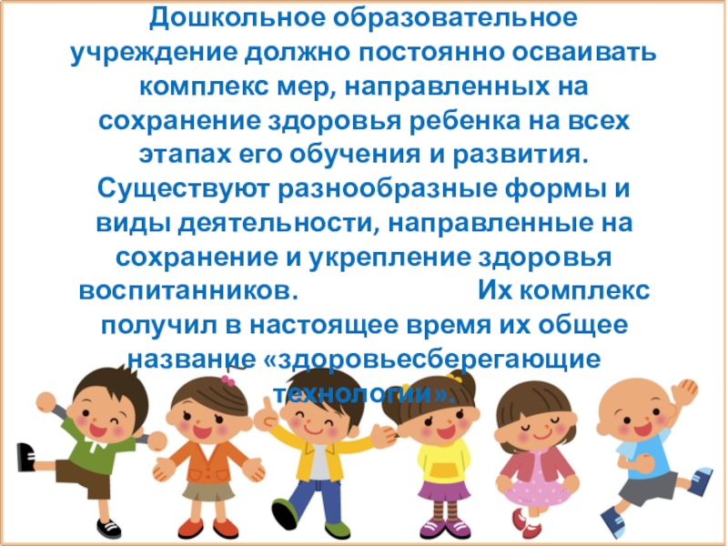 Существуют разнообразные формы и виды деятельности, направленные на сохранение и укрепление здоровья воспитанников. Их комплекс получил в настоящее время их общее название «здоровьесберегающие технологии».