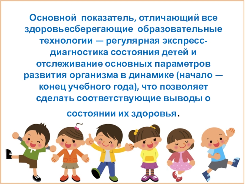Слайд 5Основной показатель, отличающий все здоровьесберегающие образовательные технологии — регулярная экспресс-диагностика состояния