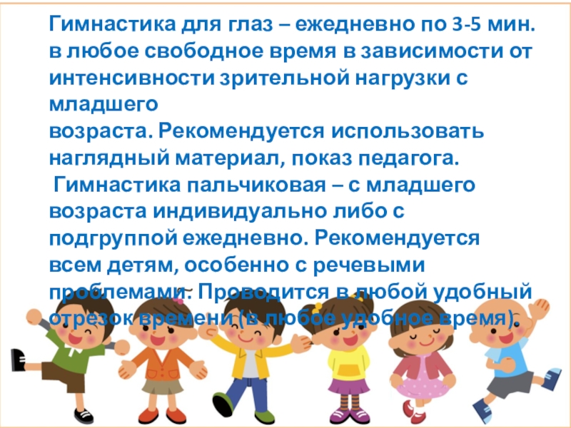 Гимнастика пальчиковая – с младшего возраста индивидуально либо с подгруппой ежедневно. Рекомендуется всем детям, особенно с речевыми