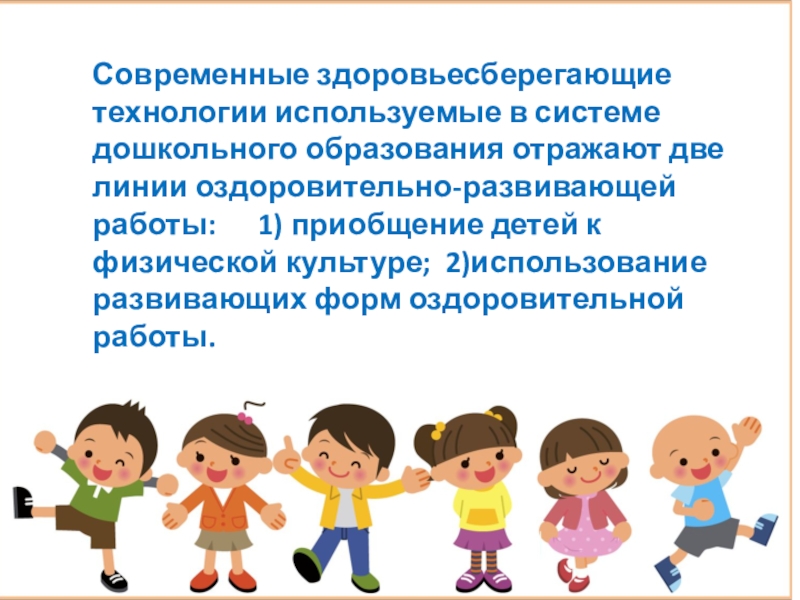 1) приобщение детей к физической культуре; 2)использование развивающих форм оздоровительной работы.