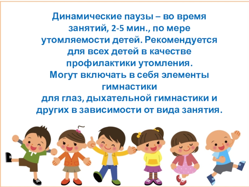 Рекомендуется для всех детей в качестве профилактики утомления. Могут включать в себя элементы гимнастики