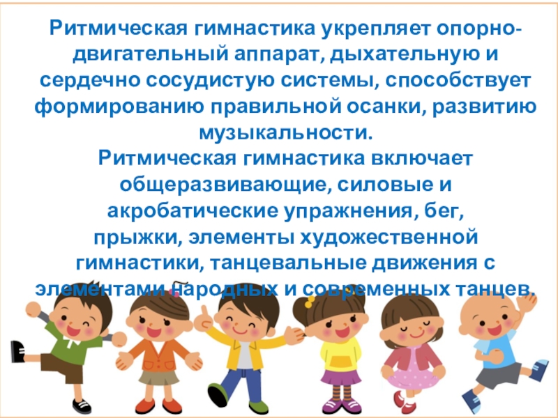 Ритмическая гимнастика укрепляет опорно-двигательный аппарат, дыхательную и сердечно сосудистую системы, способствует
