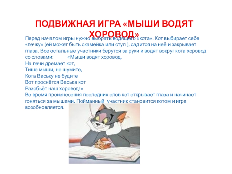 Кот выбирает себе «печку» (ей может быть скамейка или стул ), садится на неё и закрывает глаза. Все остальные участники берутся за руки и водят вокруг кота хоровод со словами: «Мыши водят хоровод,