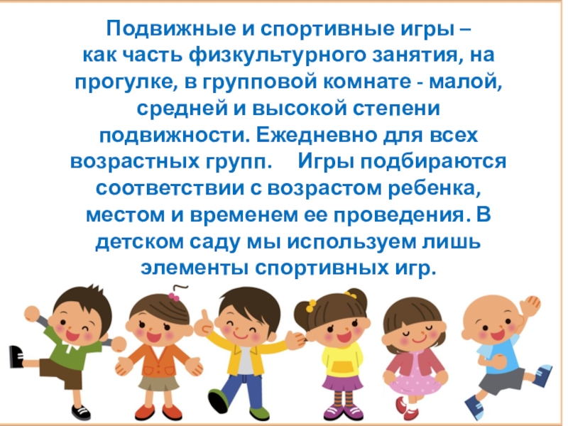 средней и высокой степени подвижности. Ежедневно для всех возрастных групп. Игры подбираются соответствии с возрастом ребенка, местом и временем ее проведения. В детском саду мы используем лишь
