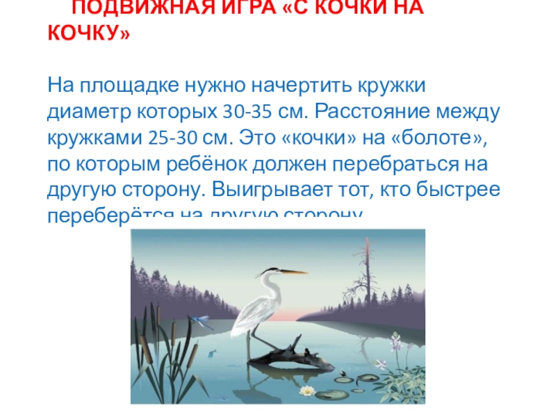 начертить кружки диаметр которых 30-35 см. Расстояние между кружками 25-30 см. Это «кочки» на «болоте», по которым ребёнок должен перебраться на другую сторону. Выигрывает тот, кто быстрее переберётся на другую сторону.