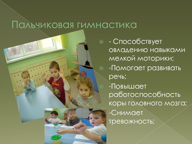 Пальчиковая гимнастика- Способствует овладению навыками мелкой моторики;-Помогает развивать речь;-Повышает работоспособность коры головного мозга;-Снимает тревожность;