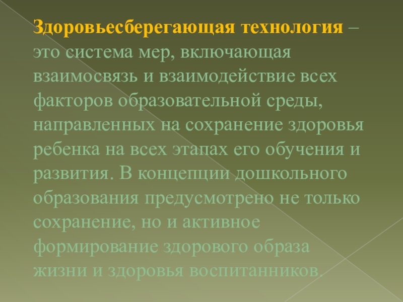 Здоровьесберегающая технология – это система мер, включающая взаимосвязь и взаимодействие всех факторов образовательной среды, направленных на сохранение здоровья ребенка на всех этапах его обучения и развития. В концепции дошкольного образования предусмотрено не только сохранение, но и