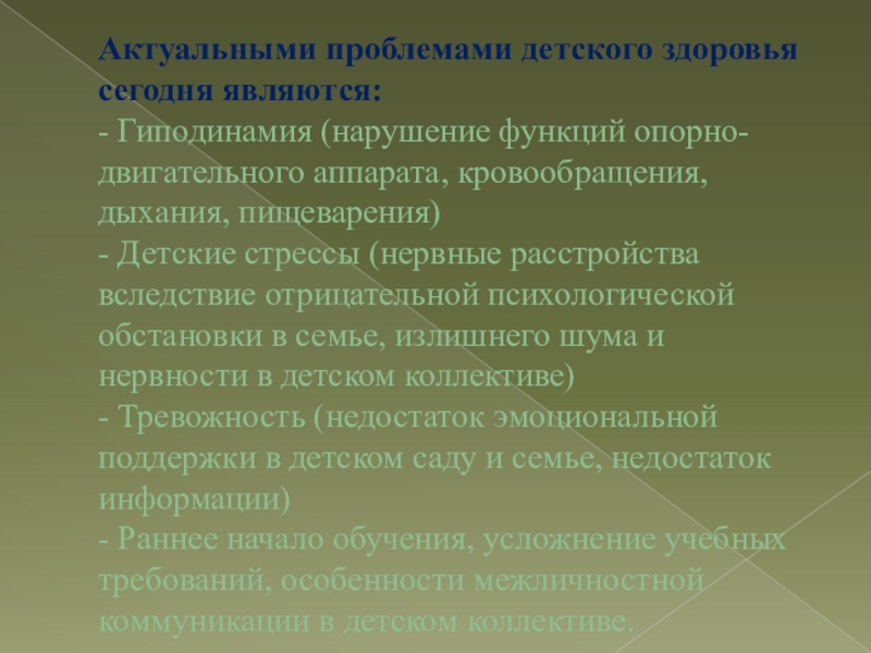 Актуальными проблемами детского здоровья сегодня являются: - Гиподинамия (нарушение функций опорно-двигательного аппарата, кровообращения, дыхания, пищеварения) - Детские