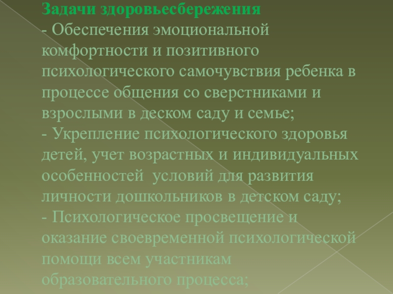 Слайд 4Задачи здоровьесбережения - Обеспечения эмоциональной комфортности и позитивного психологического самочувствия ребенка в
