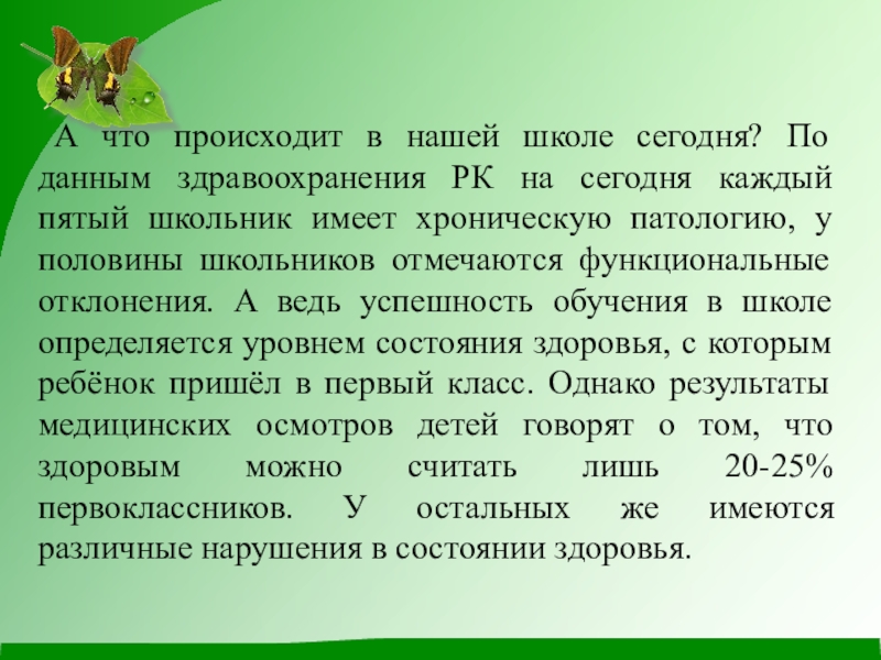 РК на сегодня каждый пятый школьник имеет хроническую патологию, у половины школьников отмечаются функциональные отклонения. А ведь успешность обучения в школе определяется уровнем состояния здоровья, с которым ребёнок пришёл в первый класс. Однако результаты медицинских осмотров детей говорят о том, что здоровым можно считать лишь 20-25% первоклассников. У остальных же имеются различные нарушения в состоянии здоровья.