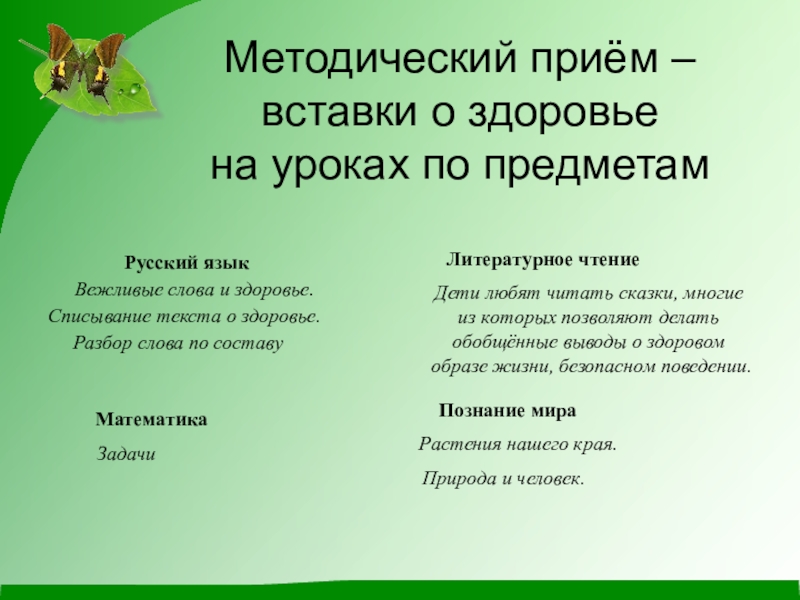 Слайд 21Методический приём – вставки о здоровье