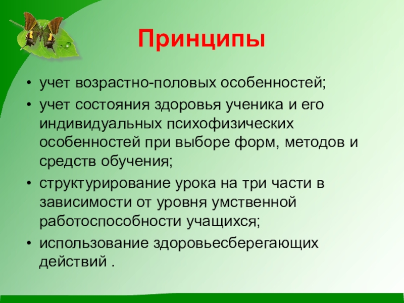 Основой здоровьесберегающей технологии является соблюдение следующих принципов: