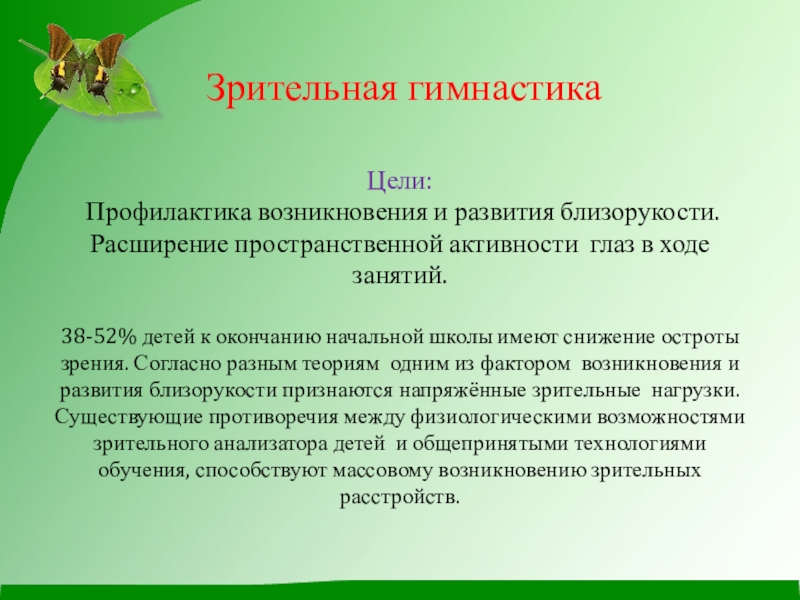 38-52% детей к окончанию начальной школы имеют снижение остроты зрения. Согласно разным теориям одним из фактором возникновения и развития близорукости признаются напряжённые зрительные нагрузки. Существующие противоречия между физиологическими возможностями зрительного анализатора детей и общепринятыми технологиями обучения, способствуют массовому возникновению зрительных расстройств.
