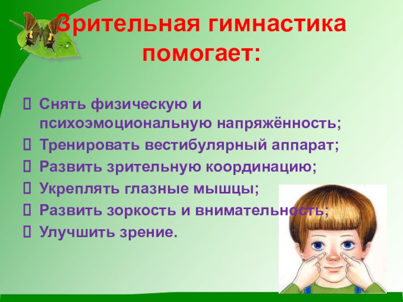 Слайд 15Зрительная гимнастика помогает: