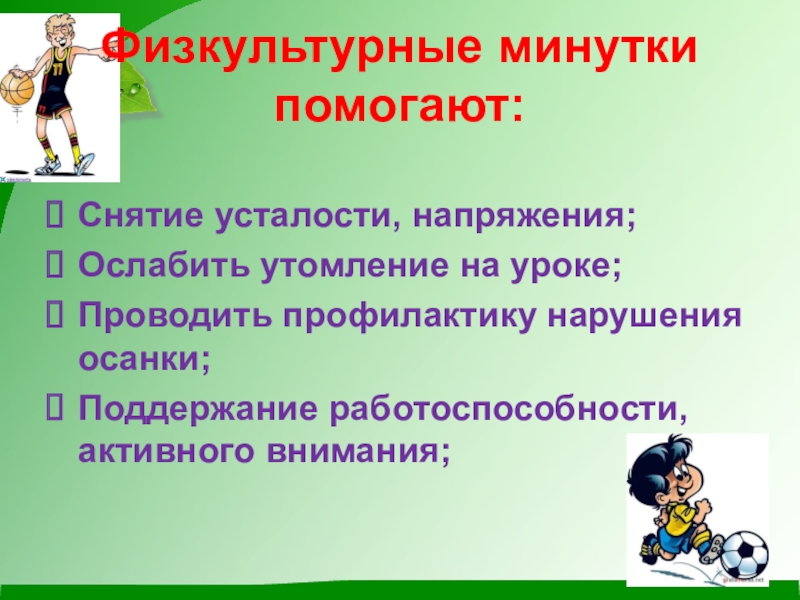 Слайд 17Физкультурные минутки помогают: