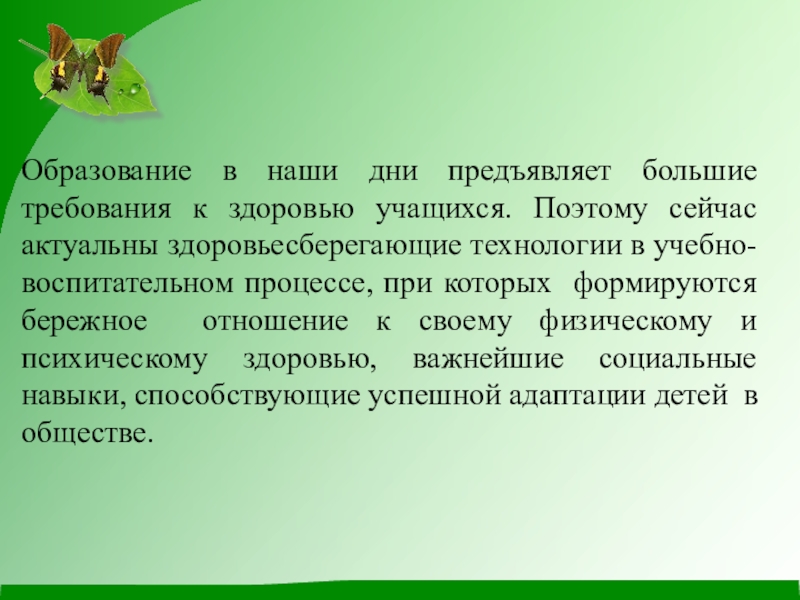 Слайд 2Образование в наши дни предъявляет большие требования к здоровью учащихся. Поэтому