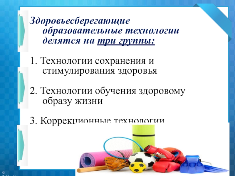 Здоровьесберегающие образовательные технологии делятся на три группы:1. Технологии сохранения и стимулирования здоровья2. Технологии обучения здоровому образу жизни3.