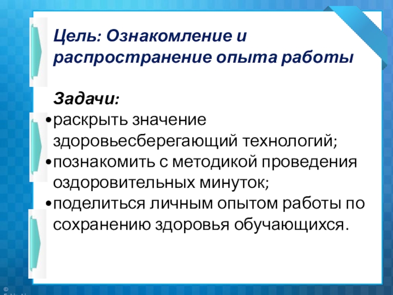 Цель: Ознакомление и распространение опыта работыЗадачи:раскрыть значение здоровьесберегающий технологий;познакомить с методикой проведения оздоровительных минуток; поделиться личным опытом работы по сохранению здоровья обучающихся.