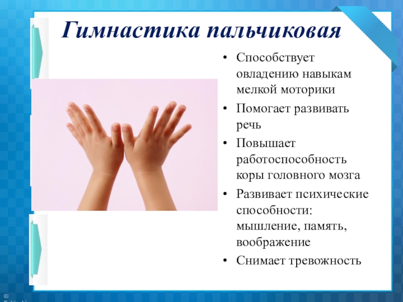 Гимнастика пальчиковая Способствует овладению навыкам мелкой моторикиПомогает развивать речьПовышает работоспособность коры головного мозгаРазвивает психические способности: мышление, память,