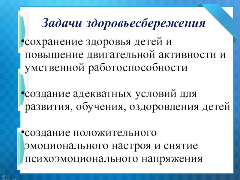 Задачи здоровьесбережения сохранение здоровья детей и повышение двигательной активности и умственной работоспособности создание адекватных условий для развития,