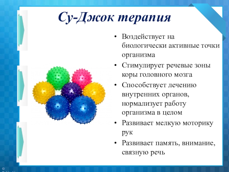 Су-Джок терапияВоздействует на биологически активные точки организмаСтимулирует речевые зоны коры головного мозгаСпособствует лечению внутренних органов, нормализует работу