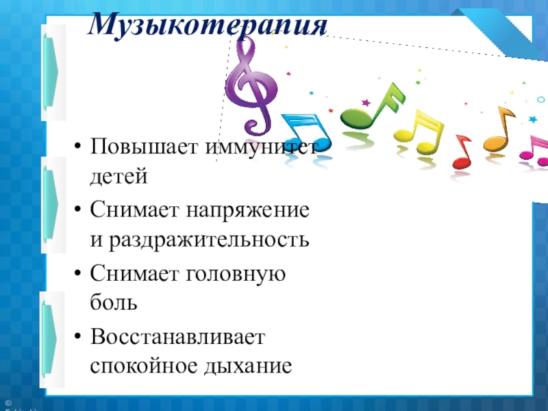 МузыкотерапияПовышает иммунитет детейСнимает напряжение и раздражительностьСнимает головную больВосстанавливает спокойное дыхание