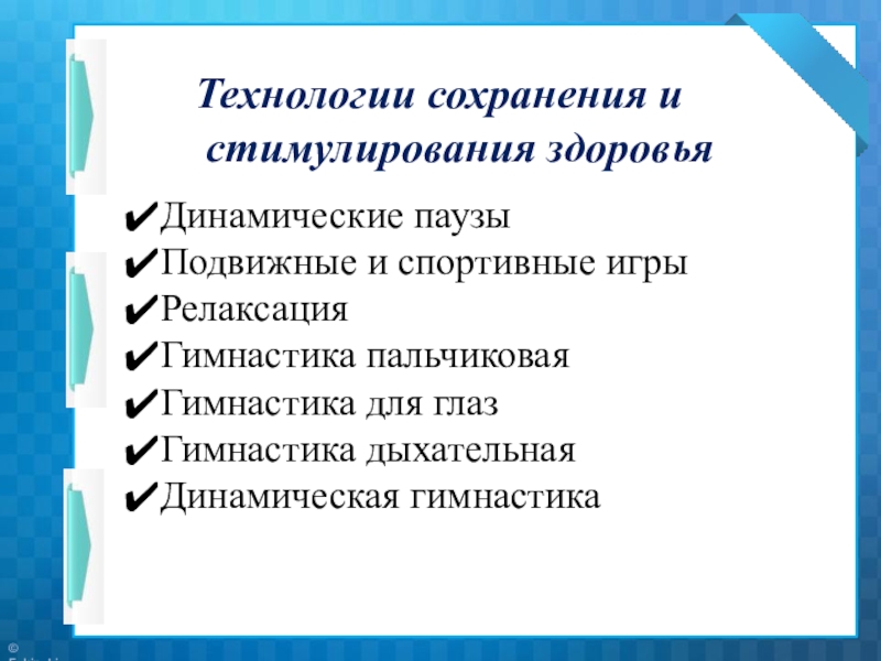 Технологии сохранения и стимулирования здоровьяДинамические паузы Подвижные и спортивные игры Релаксация Гимнастика пальчиковая Гимнастика для глаз Гимнастика