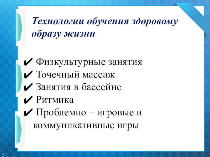 Технологии обучения здоровому образу жизни Физкультурные занятия Точечный массаж Занятия в бассейне Ритмика Проблемно – игровые и