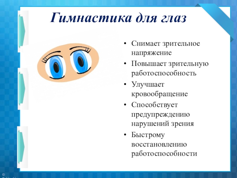 Гимнастика для глаз Снимает зрительное напряжениеПовышает зрительную работоспособностьУлучшает кровообращениеСпособствует предупреждению нарушений зренияБыстрому восстановлению работоспособности